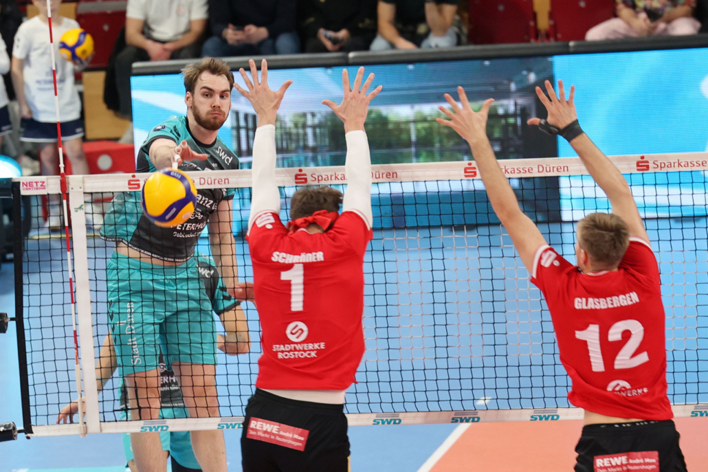 Das Spiel gegen den mit viel Spielfreude agierenden SV Warnemünde verlief in zwei Phasen. In der ersten hatte Düren viel Spaß und ließ im ersten Satz auch nicht locker, als die Führung deutlich und der Gegner völlig überfordert war. Philipp Lauter sorgte mit einem Ass für das 4:1. Anschließend hatte der Gegner viel Respekt vor der gut postierten Block- und Feldabwehr der Gastgeber. Einige Angriffe landeten deswegen im Aus. Nach zwei erfolgreichen Gegenangriffen von Robin Baghdady war Düren auf 15:9 weg und ließ nicht locker. Das zeigte Sjors Tijhuis beim Satzball beim Stand von 24:14. Mit Anlauf hechtete einem Ball hinterher und konnte diesen sicher. Zwei Ballkontakte später hämmert Petteri Tyynismaa den Gegenangriff ins Feld.